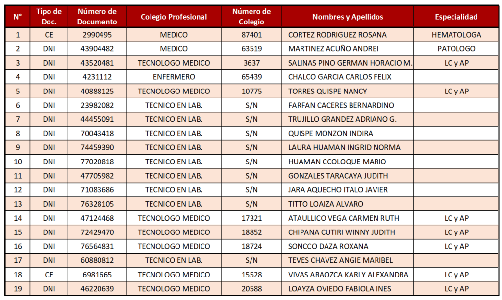 Nomina de Personal que Labora en Banco de Sangre